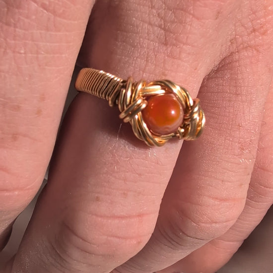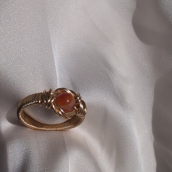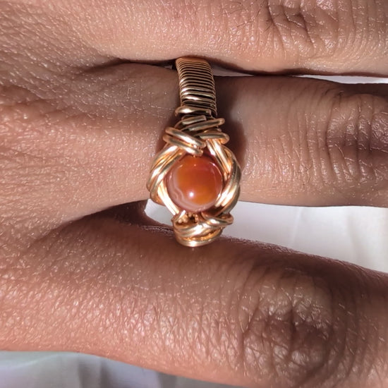 Experience the allure of natural beauty with this carnelian ring, where a rich, fiery carnelian bead is wrapped in warm copper and expertly hand-woven into a unique jewelry piece. Its intricate craftsmanship highlights the stone’s vibrant color, making it a striking accessory that effortlessly elevates any outfit. Embrace a blend of elegance and artisanal charm with this unforgettable ring.